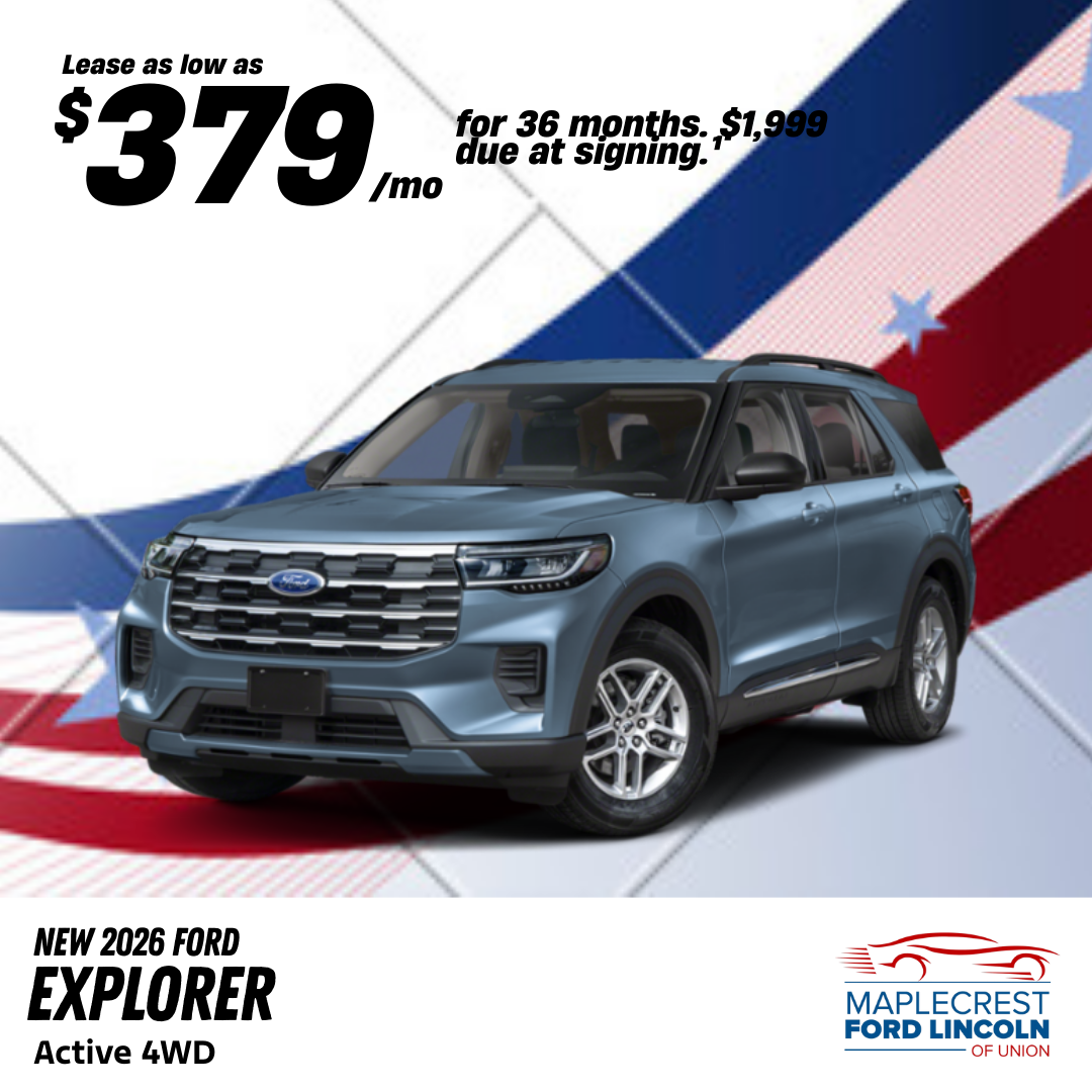 2026 Ford Explorer Active 4WD, Example VIN: 1FMUK8DH3TGA05565, Model #: 26Y32, TSRP: $44,580. ¹Lease for $379 per month for 36 months with $1,999 due at signing plus tax, title, license and registration fees, any emission testing charges, $498 dealer documentation fee, and $695 lease acquisition fee. Closed end lease. No security deposit required. 10,500 miles per year. Total cost of payments: $13,644. Lease includes $1,500 RCL Renewal . Must qualify for all rebates and programs. Not all lessees will qualify. Option to purchase for $29,423 at lease end. Lessee is responsible for insurance, maintenance, repairs, excess wear, $399 disposition fee, and mileage charges of $0.20 per mile over 31,500 total miles. Lease available to well qualified buyers through Ford Motor Credit and is subject to credit approval. *Image for illustration purposes. Cannot be combined with other offers. Offers end on 03/02/2026. Manufacturer reserves the right to change their incentives at any time without notice. See dealer for complete details.