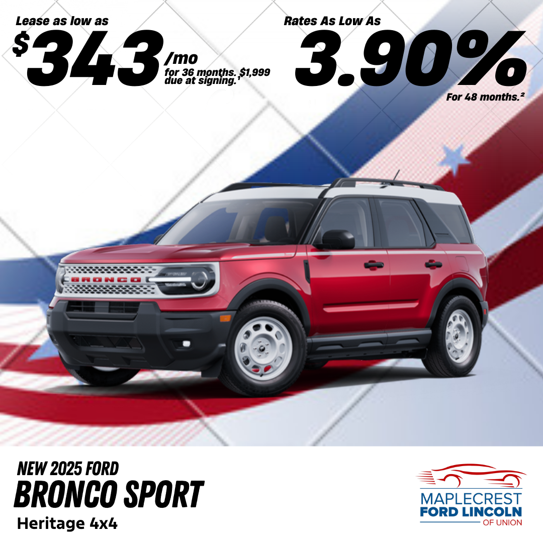 2025 Ford Bronco Sport Heritage 4x4, Example VIN: 3FMCR9GN8SRF16565, Model #: 25B138, TSRP: $38,680. ¹Lease for $343 per month for 36 months with $1,999 due at signing plus tax, title, license and registration fees, any emission testing charges, $498 dealer documentation fee, and $695 lease acquisition fee. Closed end lease. No security deposit required. 10,500 miles per year. Total cost of payments: $12,348. Lease includes $1,000 Bonus Customer Cash, $1,500 Competitive Conquest Bonus Cash. Must qualify for all rebates and programs. Not all lessees will qualify. Option to purchase for $22,048 at lease end. Lessee is responsible for insurance, maintenance, repairs, excess wear, $399 disposition fee, and mileage charges of $0.20 per mile over 31,500 total miles. Lease available to well qualified buyers through Ford Motor Credit and is subject to credit approval. ²3.90% APR financing for 48 months. $22.53 per month per $1,000 financed at 48 months. APR financing available to well qualified buyers through Ford Motor Credit and is subject to credit approval. Not available on balloon financing. Not all will qualify. *Image for illustration purposes. Individual offers cannot be combined. Cannot be combined with other offers not listed. Offers end on 03/02/2026. Manufacturer reserves the right to change their incentives at any time without notice. See dealer for complete details.