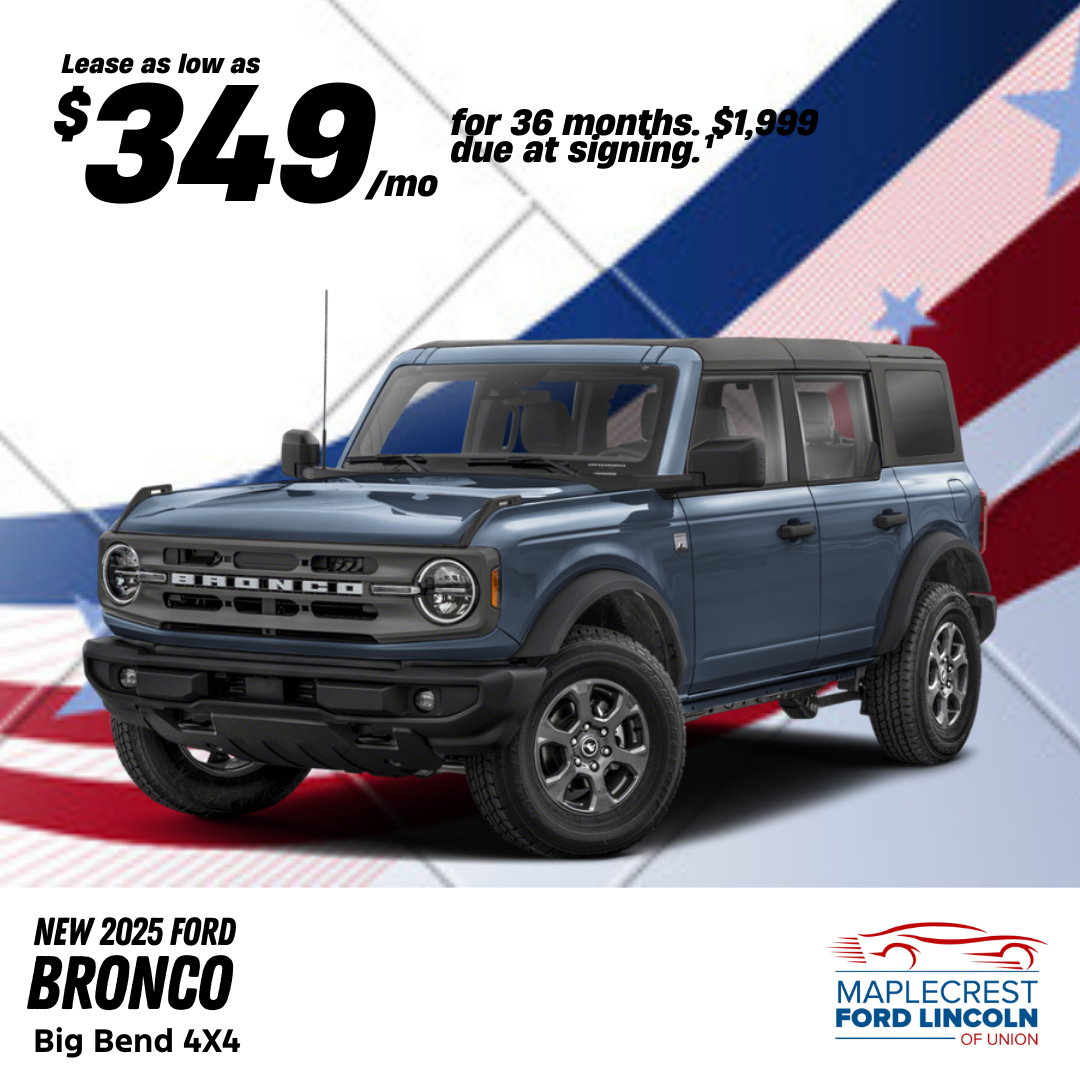 2025 Ford Bronco Big Bend 4X4, Example VIN: 1FMDE7BH3SLB82353, Model #: 25B256, TSRP: $46,175. ¹Lease for $349 per month for 36 months with $1,999 due at signing plus tax, title, license and registration fees, any emission testing charges, $498 dealer documentation fee, and $695 lease acquisition fee. Closed end lease. No security deposit required. 10,500 miles per year. Total cost of payments: $12,564. Lease includes $1,500 Bonus Customer Cash, $1,500 Competitive Conquest Bonus Cash. Must qualify for all rebates and programs. Not all lessees will qualify. Option to purchase for $32,323 at lease end. Lessee is responsible for insurance, maintenance, repairs, excess wear, $399 disposition fee, and mileage charges of $0.20 per mile over 31,500 total miles. Lease available to well qualified buyers through Ford Motor Credit and is subject to credit approval. *Image for illustration purposes. Cannot be combined with other offers. Offers end on 03/02/2026. Manufacturer reserves the right to change their incentives at any time without notice. See dealer for complete details.