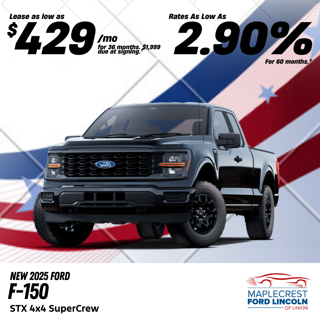 2025 Ford F-150 STX 4x4 SuperCrew, Example VIN: 1FTEW2LP7SKD77506, Model #: 25F75, TSRP: $51,760. ¹Lease for $429 per month for 36 months with $1,999 due at signing plus tax, title, license and registration fees, any emission testing charges, $498 dealer documentation fee, and $695 lease acquisition fee. Closed end lease. No security deposit required. 10,500 miles per year. Total cost of payments: $15,444. Lease includes $1,250 Bonus Customer Cash, $750 Engine Specific RCL Cash. Must qualify for all rebates and programs. Not all lessees will qualify. Option to purchase for $33,126 at lease end. Lessee is responsible for insurance, maintenance, repairs, excess wear, $399 disposition fee, and mileage charges of $0.20 per mile over 31,500 total miles. Lease available to well qualified buyers through Ford Motor Credit and is subject to credit approval. ²2.90% APR financing for 60 months. $17.92 per month per $1,000 financed at 60 months. APR financing available to well qualified buyers through Ford Motor Credit and is subject to credit approval. Not available on balloon financing. Not all will qualify. *Image for illustration purposes. Individual offers cannot be combined. Cannot be combined with other offers not listed. Offers end on 03/02/2026. Manufacturer reserves the right to change their incentives at any time without notice. See dealer for complete details.